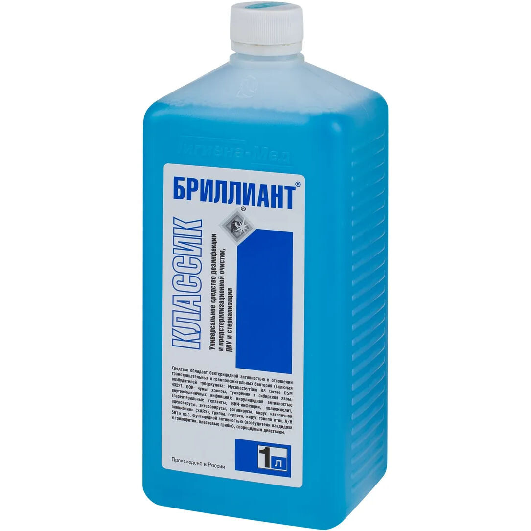 БРИЛЛИАНТ классик является универсальным препаратом, который отличается низкой токсичностью. Годен в течение 5 лет при хранении в оригинальной упаковке. Выпускается во флаконах объемом 1 л и канистрах объемом 5 л. Антимикробная активность БРИЛЛИАНТ кла...